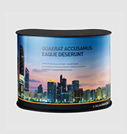 All our straight pop up counters consist of a collapsible metal frame, a silver cover plate, plastic insert panels, and a counter cladding made of printed polyester. Quick to set up without tools, the pop up counter offers a storage solution to neatly pack away internal documents and materials weighing up to 15 kg and an appealing area for presentation and sales activities and to exchange with visitors. The cladding of the pop up counter is quick and easy to apply and to remove thanks to the hook-and-loop fastener. The durable material with antistatic properties covers the front and the sides of the pop up counter and can be printed over the full area. All components of the exhibition pop up counter fit neatly into the supplied wheeled storage case. A custom-designed pop up counter highlights any exhibition stands and turns it into the centre of attention!