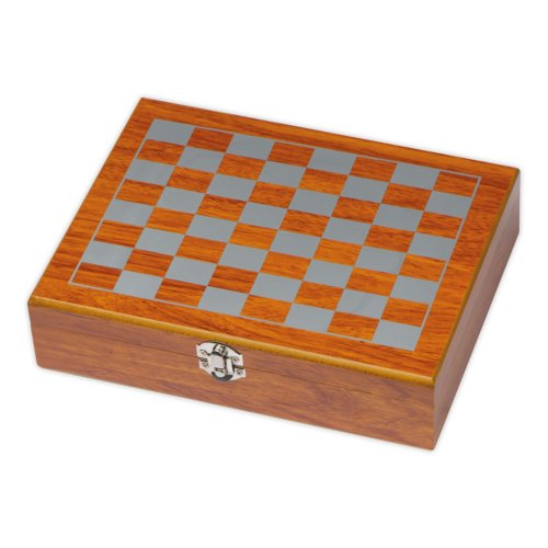Wooden game set with chess pieces, dice, playing cards and flask.