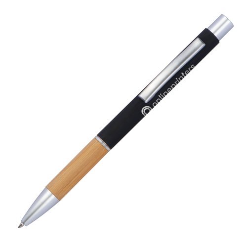 - Retractable ballpoint pen made of aluminium with a bamboo grip zone and a blue refill