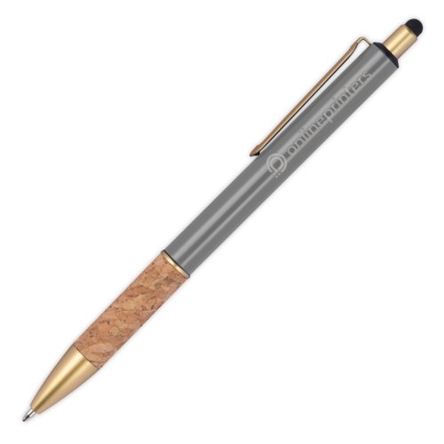 - Metal ball pen with golden applications, blue-writing refill and cork grip zone