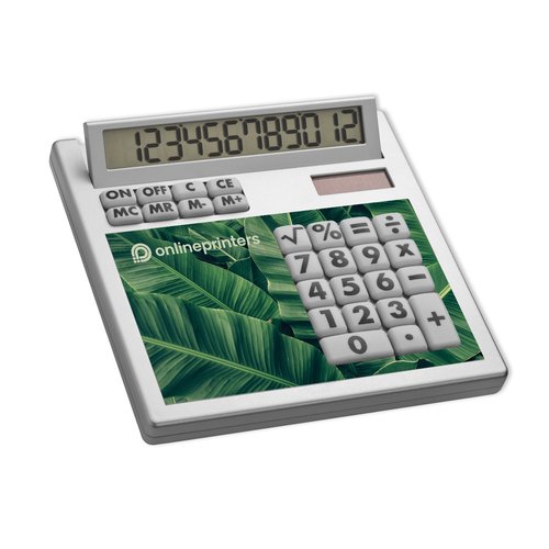 - CrisMa custom design, solar-powered desk calculators with 12 digits in silver plastic