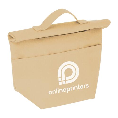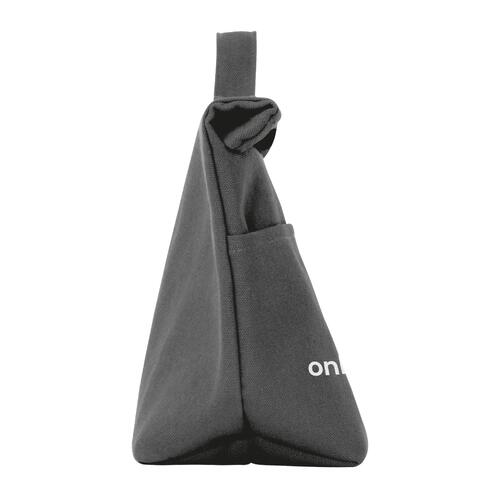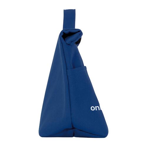 - The bag features a carrying handle, a wide hook-and-loop fastener for closure, and a front pocket