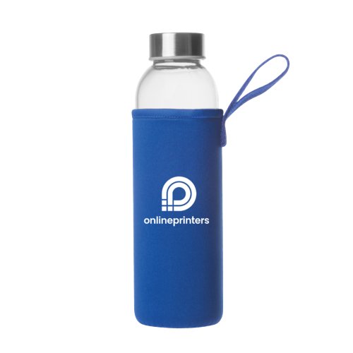 - Glass water bottle with metal lid and matching neoprene sleeve with carry handle