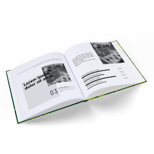 - Hard cover book in portrait format with a straight spine and square corners, including a white endband