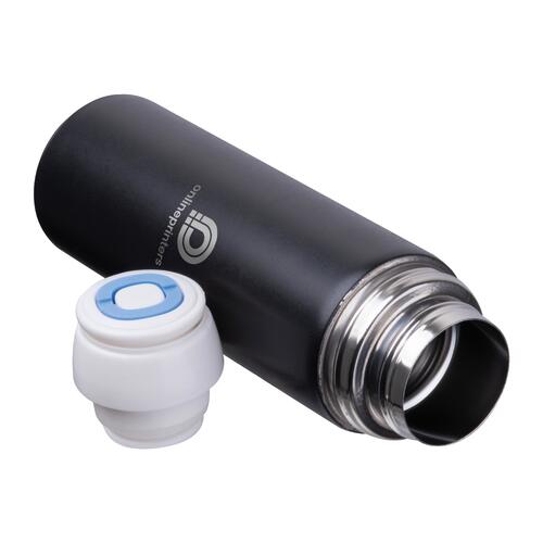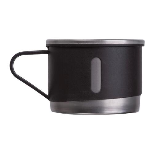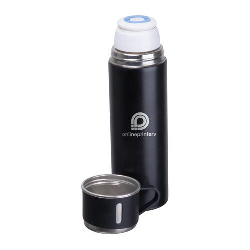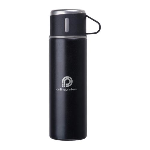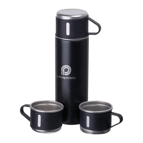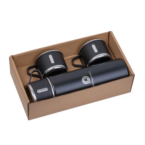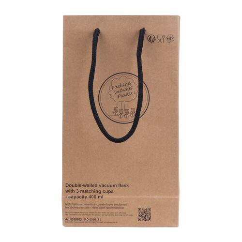 - Insulated bottle set consisting of a double-walled stainless steel insulated bottle (400 ml) with quick-release cap and three stainless steel drinking cups (120 ml) with plastic coating