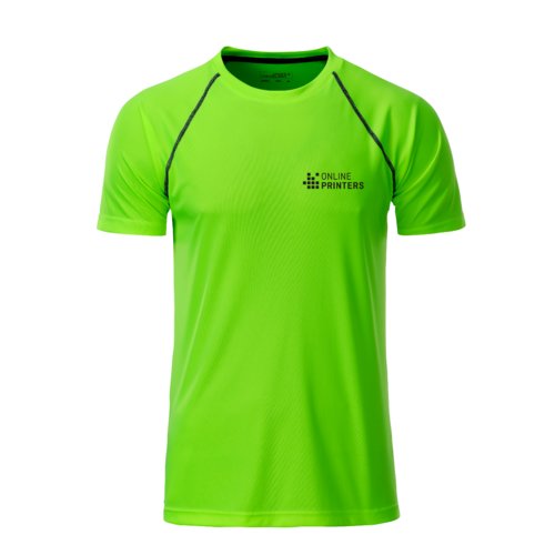 Neon yellow/blue polyester T-shirt for men with short sleeves.