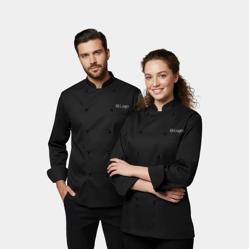 Black fabric chef jacket with long sleeves and a breast pocket.