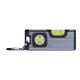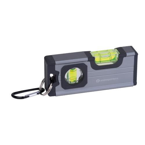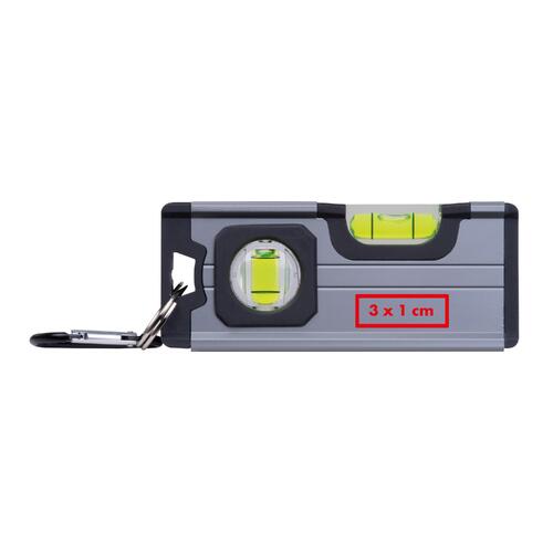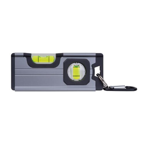 - Mini spirit level made of aluminum with ABS plastic applications, two vials, a magnet on the bottom, and a carabiner