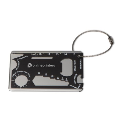 - luggage tags with 8 functions: letter opener, 5 cm ruler, bottle and can opener, screwdriver, compass, wrench and vegetable peeler