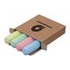 - Sidewalk chalk set consisting of 4 chalks in blue, red, green, and yellow, packaged in a cardboard box