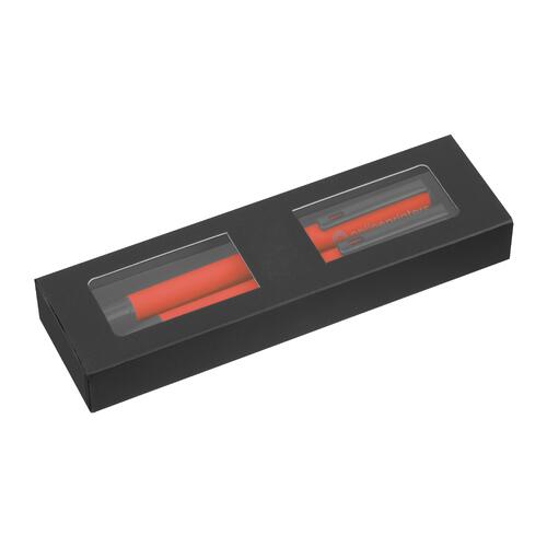 - Writing set made from aluminium consisting of a black-ink rollerball pen and a blue-ink twist ballpoint pen (with large-capacity plastic refill), packaged in a box